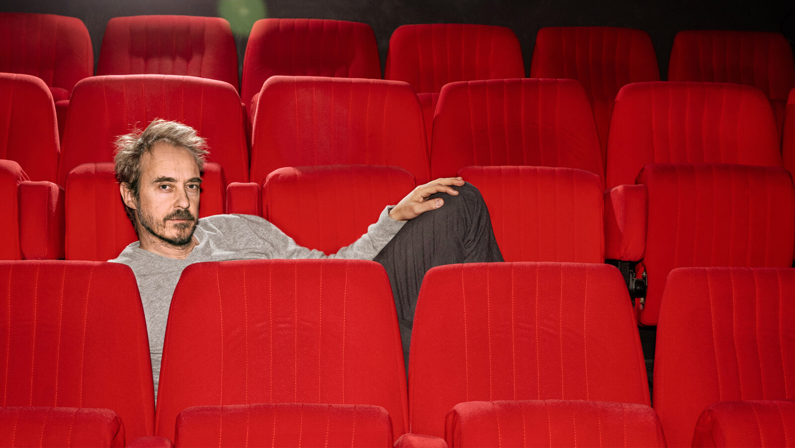 Jonas Karlsson äntrar röda mattan tillsammans med de andra skådespelarna. Han bär en tunn ylletröja och håret står lite på ända.