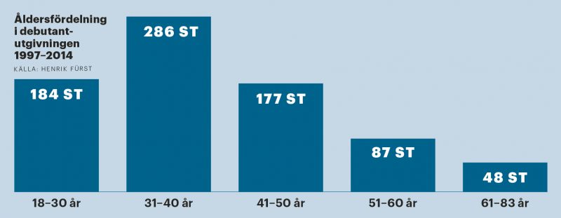 Enligt forskaren Henrik Fürst debuterar kvinnor senare än män. Sammantaget sker de flesta romandebuter mellan 30 och 40, vilket är sent om man jämför bakåt i tiden – till exempel med 1970-talet då tongivande författare som Klas Östergren, Eva Runefelt och Gun-Britt Sundström debuterade strax efter 20. I dag noterar förläggarna att 90-talisterna fortfarande är ganska ovanliga i manushögarna och att de definitivt får in färre manus från personer i 20-årsåldern (även om det finns undantag: debutanterna Anna Axfors, Ellen Greider och Ebba Hyltmark är några).